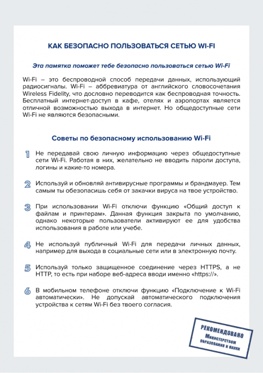 - Не используй публичный WI-FI для передачи личных данных, например для выхода в социальные сети или в электронную почту;