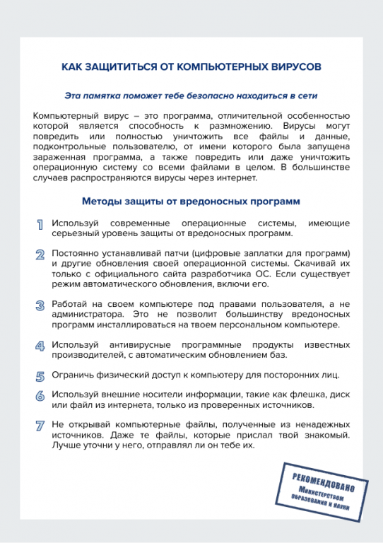 - Используй антивирусные программные продукты известных производителей, с автоматическим обновлением баз;